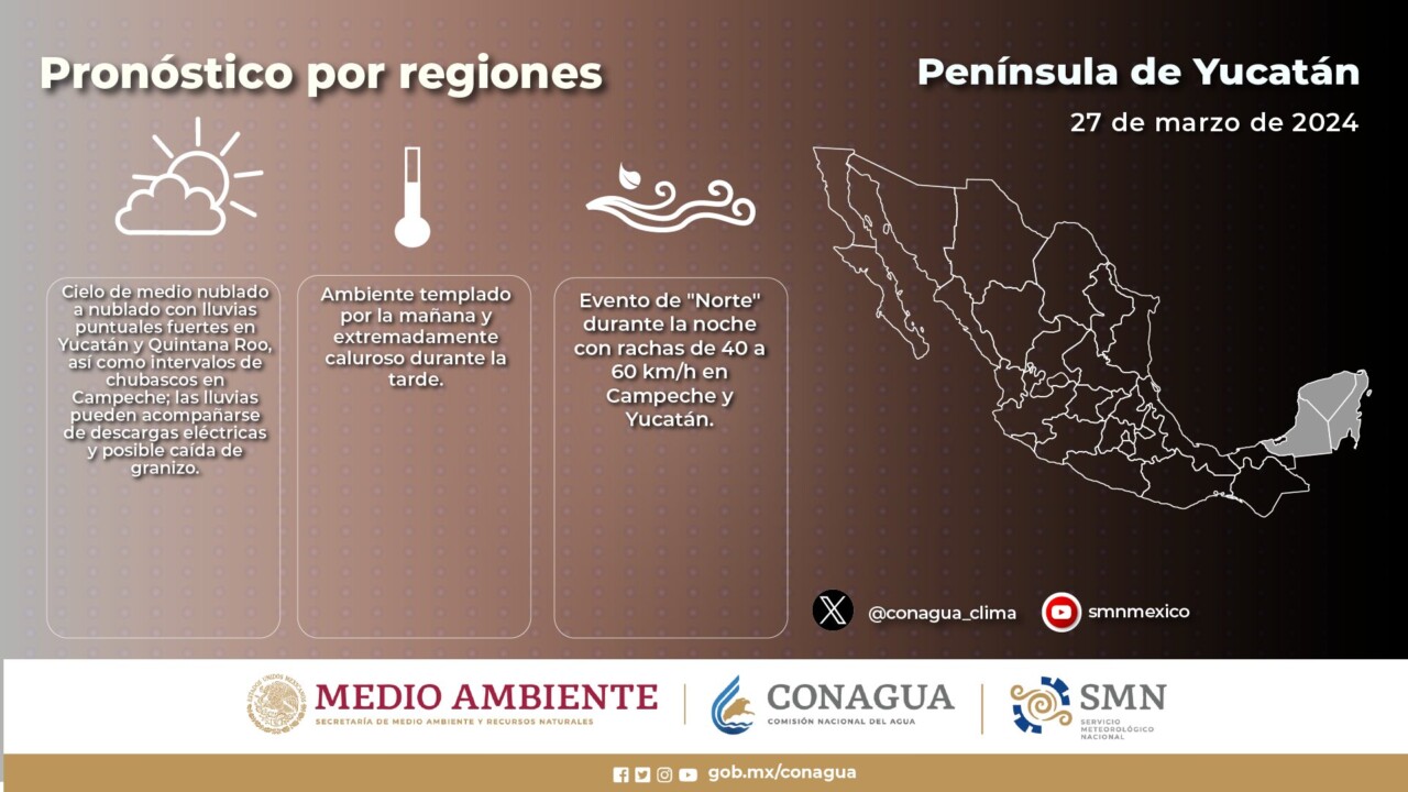Península de Yucatán: Cielo medio nublado a nublado con lluvias puntuales fuertes en Yucatán y Quintana Roo, así como intervalos de chubascos en Campeche; las lluvias pueden acompañarse de descargas eléctricas y posible caída de granizo. Ambiente templado por la mañana y extremadamente caluroso durante la tarde. Evento de «Norte» durante la noche con rachas de 40 a 60 km/h en Campeche y Yucatán.
