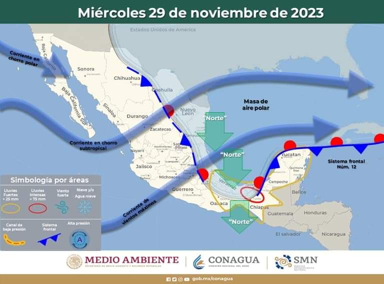 Asimismo, la masa de aire mantendrá viento de componente norte con rachas de 60 a 80 km/h en el Istmo de Tehuantepec, y con oleaje de 2 a 4 metros en la costa sur de Veracruz y el Golfo de Tehuantepec. En el transcurso de la tarde-noche, se prevé que el frente deje de afectar al territorio nacional.