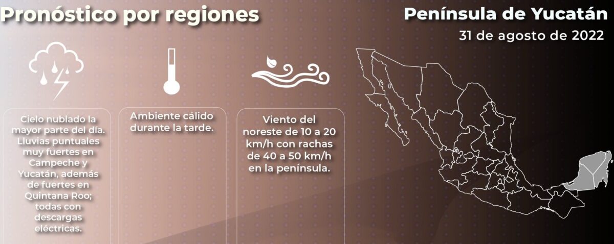 Península de Yucatán: Cielo nublado la mayor parte del día. Lluvias puntuales muy fuertes en Campeche y Yucatán, además de fuertes en Quintana Roo; todas con descargas eléctricas. Ambiente cálido por la tarde y viento del noreste de 10 a 20 km/h con rachas de 40 a 50 km/h en la península.