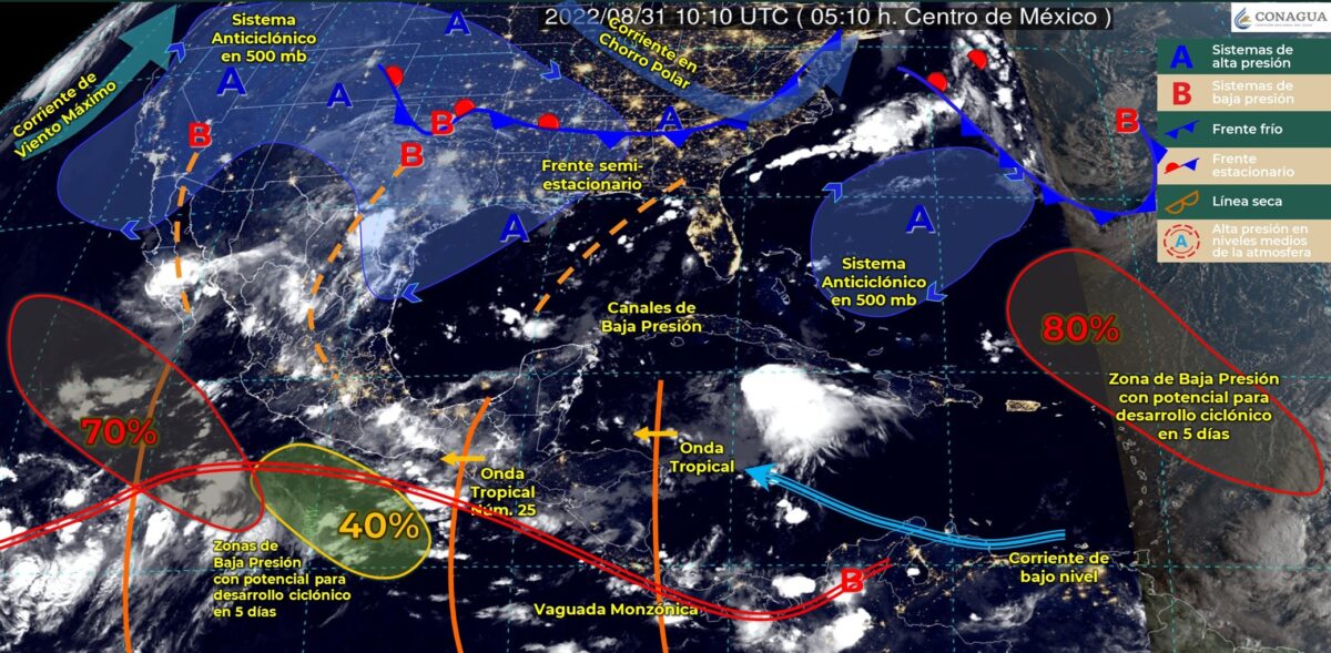 La onda tropical número 25 se desplazará sobre las costas de Oaxaca y producirá lluvias puntuales intensas en dicha entidad, además de Tabasco y Chiapas, así como puntuales muy fuertes en Veracruz.