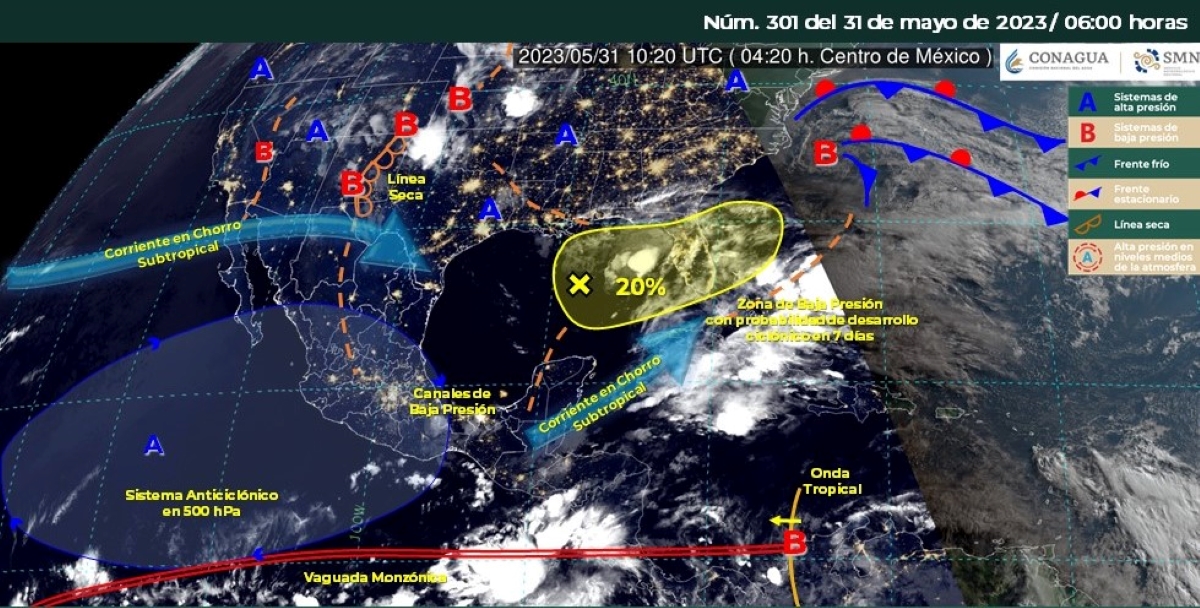 Pronóstico del clima para hoy miércoles 31 de mayo 2023 en Quintana Roo. Este día, una línea seca y la corriente en chorro subtropical mantendrán lluvias y chubascos, así como fuertes vientos en el noroeste, norte y noreste del país. Mientras que canales de baja presión sobre la Mesa Central, la Península de Yucatán y el sureste de México, en interacción con inestabilidad en la atmósfera superior y con una circulación de baja presión sobre el centro del Golfo de México, ocasionarán lluvias puntuales muy fuertes en Chiapas, Yucatán y Quintana Roo.