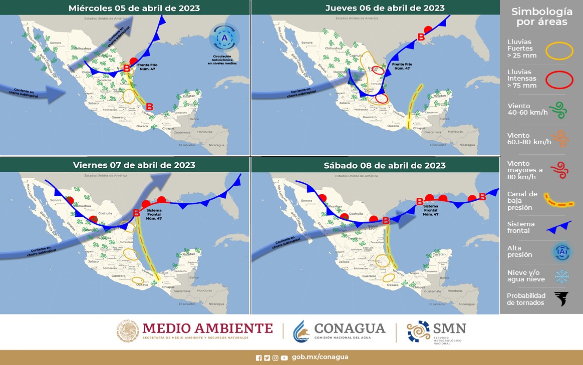 Pronóstico del clima para hoy miércoles 5 de marzo 2023 en Quintana Roo. Para este día, el frente frío número 47 se desplazará sobre el norte y noreste del país, interaccionará con un canal de baja presión sobre el oriente de la República Mexicana y con la corriente en chorro subtropical, originando lluvias puntuales muy fuertes en Nuevo León, Tamaulipas e Hidalgo.
