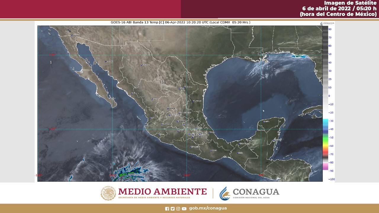 Golfo de México: Cielo parcialmente nublado durante el día con lluvias aisladas por la tarde en Veracruz y Tabasco. Sin lluvia en Tamaulipas. Ambiente fresco a templado por la mañana. Durante la tarde ambiente caluroso a muy caluroso. Evento de «Norte» con rachas de 50 a 60 km/h en Tamaulipas y norte de Veracruz, a partir de esta noche y madrugada del jueves.