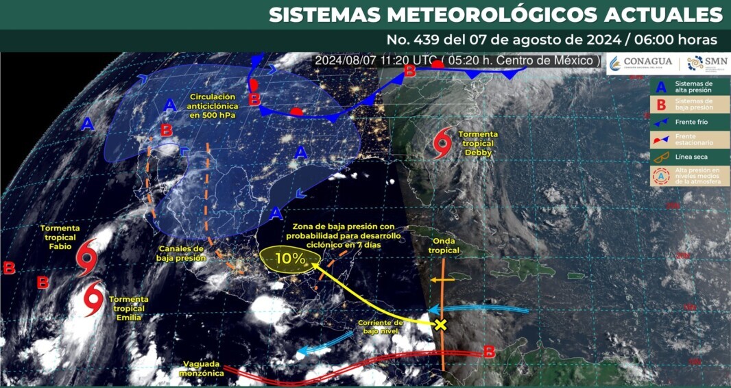 Pronóstico del clima para hoy miércoles 7 de agosto 2024 en Quintana Roo. Este día, las tormentas tropicales Fabio y Emilia estarán muy próximas una de otra y se localizarán al oeste-suroeste de las costas de Baja California Sur, originando un amplio sistema ciclónico que podría fusionar ambos ciclones (efecto Fujiwhara) al finalizar este día. Su amplia circulación ocasionará chubascos y oleaje de 1 a 3 metros de altura en las costas de dicho estado.