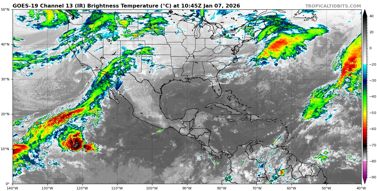 Pronóstico del clima para hoy miércoles 7 de enero 2026 en Quintana Roo.- Para este día, el frente frío número 27 se desplazará sobre el noroeste y norte del país, en combinación con una circulación ciclónica en niveles medios y altos de la atmósfera, además de las corrientes en chorro polar y subtropical, propiciarán intervalos de chubascos y vientos fuertes a muy fuertes en dichas regiones; con lluvias puntuales fuertes en Baja California, Sonora y Chihuahua.