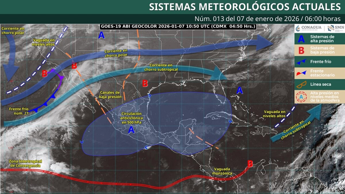 Pronóstico del clima para hoy miércoles 7 de enero 2026 en Quintana Roo.- Para este día, el frente frío número 27 se desplazará sobre el noroeste y norte del país, en combinación con una circulación ciclónica en niveles medios y altos de la atmósfera, además de las corrientes en chorro polar y subtropical, propiciarán intervalos de chubascos y vientos fuertes a muy fuertes en dichas regiones; con lluvias puntuales fuertes en Baja California, Sonora y Chihuahua.