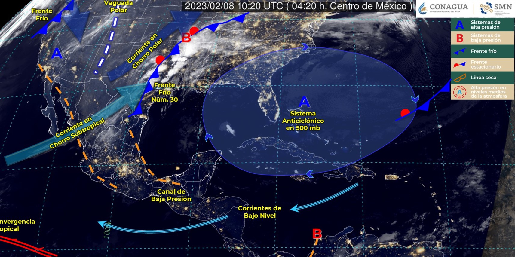 Pronóstico del clima para hoy miércoles 8 de febrero en Quintana Roo. Este día, el frente frío número 30 se desplazará sobre el noreste y oriente del territorio nacional, interaccionará con un canal de baja presión que se extenderá sobre el sureste de México, originando lluvias puntuales fuertes en Hidalgo, Puebla, Veracruz y Oaxaca, lluvias y chubascos en Tamaulipas, San Luis Potosí, Querétaro, Chiapas, Estado de México, Ciudad de México, Tlaxcala, Campeche y Quintana Roo, además de lluvias aisladas en Tabasco y Yucatán.