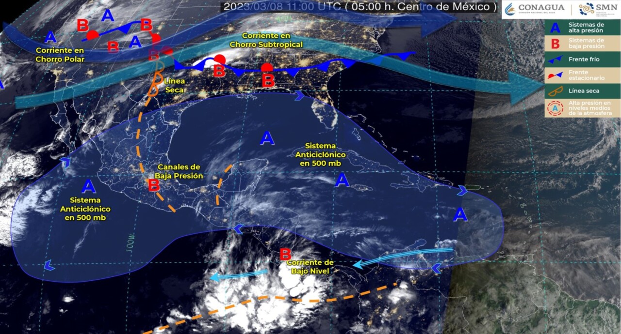 Pronóstico del clima para hoy miércoles 8 de marzo 2023 en Quintana Roo. Un canal de baja presión en el sureste del país y la entrada de humedad del Golfo de México y Mar Caribe, generarán lluvias con intervalos de chubascos en Oaxaca y Chiapas, además de lluvias aisladas en Puebla, Veracruz, Yucatán y Quintana Roo.
