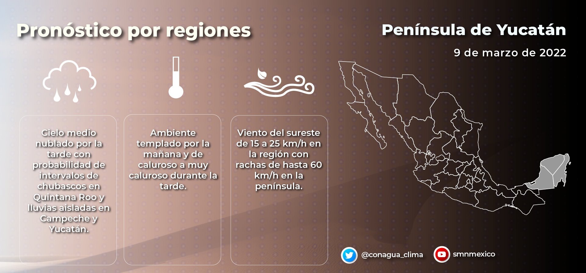Península de Yucatán: Cielo parcialmente nublado por la mañana y medio nublado por la tarde con probabilidad de lluvias aisladas. Ambiente matutino fresco a templado y caluroso a muy caluroso durante la tarde. Viento del sureste de 15 a 30 km/h en la región, con rachas de 40 a 50 km/h en Campeche, Yucatán y Quintana Roo.