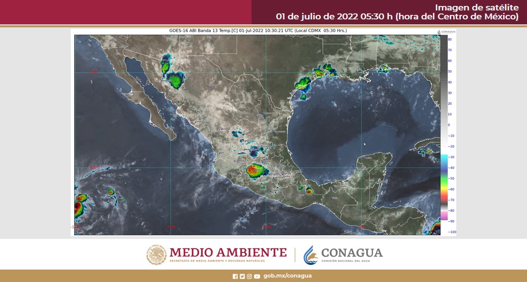 Pronóstico del clima para hoy viernes 1 de julio en Quintana Roo. Para este día, el monzón mexicano mantendrá las condiciones para lluvias fuertes en el noroeste de la República Mexicana, pronosticándose lluvias puntuales muy fuertes, descargas eléctricas y posibles granizadas en Sonora, Chihuahua y Durango. Un canal de baja presión sobre el occidente y centro del país, en combinación con la onda tropical Núm. 8 que recorrerá el sur del país, ocasionarán lluvias fuertes con tormentas eléctricas en dichas regiones, previéndose lluvias puntuales muy fuertes en Guerrero. Otro canal de baja presión en la Península de Yucatán y la entrada de humedad del Mar Caribe ocasionarán, en horas de la tarde, lluvias fuertes en Campeche, Yucatán y Quintana Roo. Finalmente, continuará el ambiente vespertino caluroso a muy caluroso sobre entidades del noroeste, norte y noreste de México, con temperaturas máximas cercanas a 45°C en zonas de Baja California, Sonora y Sinaloa.