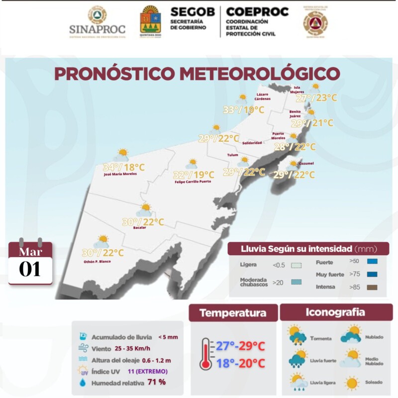 Pronóstico del clima para hoy viernes 1 de marzo de 2024 en Quintana Roo