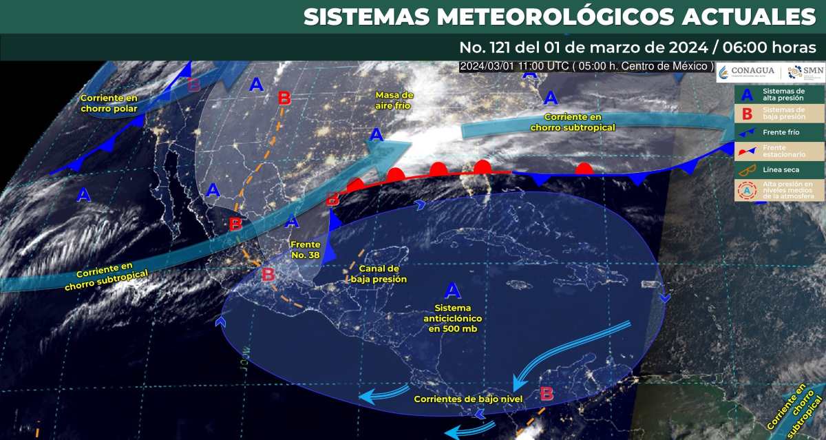 Finalmente, una circulación anticiclónica en niveles medios de la atmósfera contribuirá a mantener el ambiente vespertino cálido en entidades del noroeste, norte y centro del país, incluido el Valle de México, llegando a alcanzar temperaturas calurosas, mayores a 35 °C en zonas del occidente, sur y sureste de México y la Península de Yucatán.