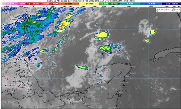 Península de Yucatán: Cielo nublado con lluvias puntuales intensas en Campeche, muy fuertes en Yucatán y fuertes en Quintana Roo. Ambiente fresco a templado durante el día. Evento de «Norte» con rachas de 50 a 70 km/h y oleaje de 1 a 3 metros de altura en las costas de Campeche y Yucatán.