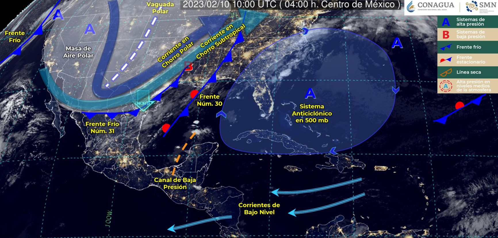 Pronóstico del clima para hoy viernes 10 de febrero en Quintana Roo. Para este día, el frente frío número 31 en interacción con una vaguada polar, las corrientes en chorro polar y subtropical, además de un canal de baja presión en el sur del Golfo de México, recorrerá el litoral de dicho Golfo y originará lluvias puntuales torrenciales en Chiapas y Tabasco, intensas en Veracruz, Oaxaca y Campeche, muy fuertes en Puebla y Yucatán, así como fuertes en Quintana Roo.