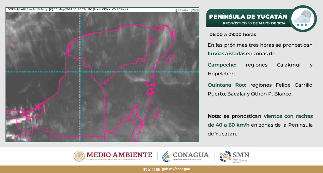 Península de Yucatán: Cielo medio nublado durante el día, con lluvias aisladas en Campeche y Quintana Roo, sin lluvia en Yucatán. Ambiente templado a cálido por la mañana. Durante la tarde, ambiente muy caluroso a extremadamente caluroso en la región.