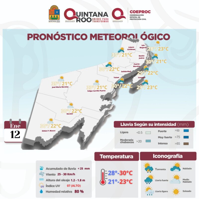 Pronóstico del clima para hoy viernes 12 de enero 2024 en Quintana Roo. Este día, el frente frío número 26 se desplazará rápidamente sobre el noreste y oriente de la República Mexicana, originando lluvias puntuales fuertes en Veracruz, Oaxaca, Chiapas y Tabasco; la masa de aire frío que lo acompaña originará vientos fuertes sobre el noreste del país, descenso de temperatura sobre el norte, noreste, oriente y centro de México, además de evento de “Norte” con rachas de 80 a 100 km/h y oleaje de 2 a 4 m de altura en las costas de Tamaulipas y Veracruz, condición que se extenderá por la noche a la costa de Tabasco.