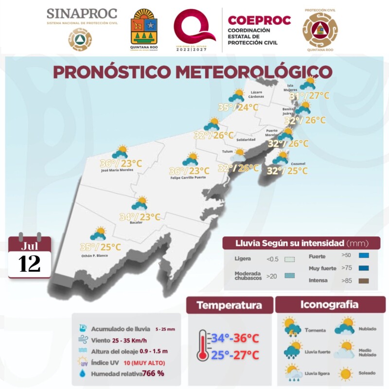 Pronóstico del clima para hoy viernes 12 de julio 2024 en Quintana Roo