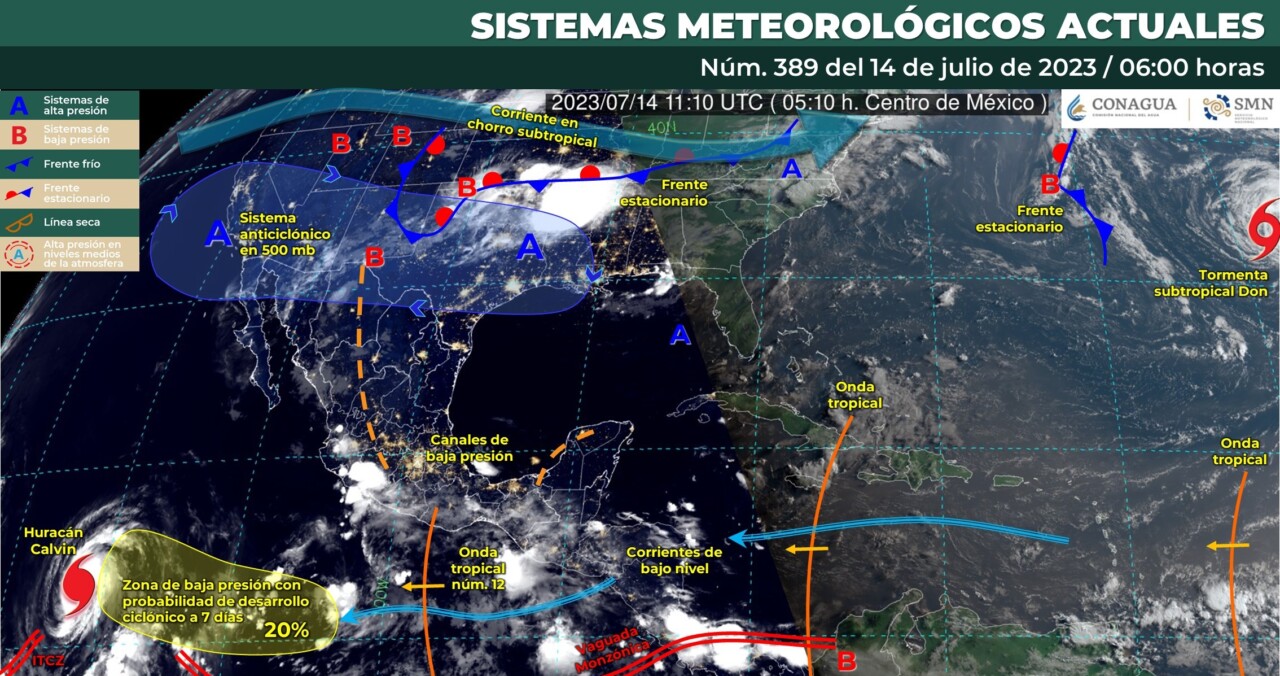La onda tropical número 12 se desplazará sobre el occidente del territorio nacional y, aunado al ingreso de humedad del Océano Pacífico, originará lluvias fuertes a puntuales muy fuertes, descargas eléctricas, rachas de viento y posible caída de granizo en dicha región.