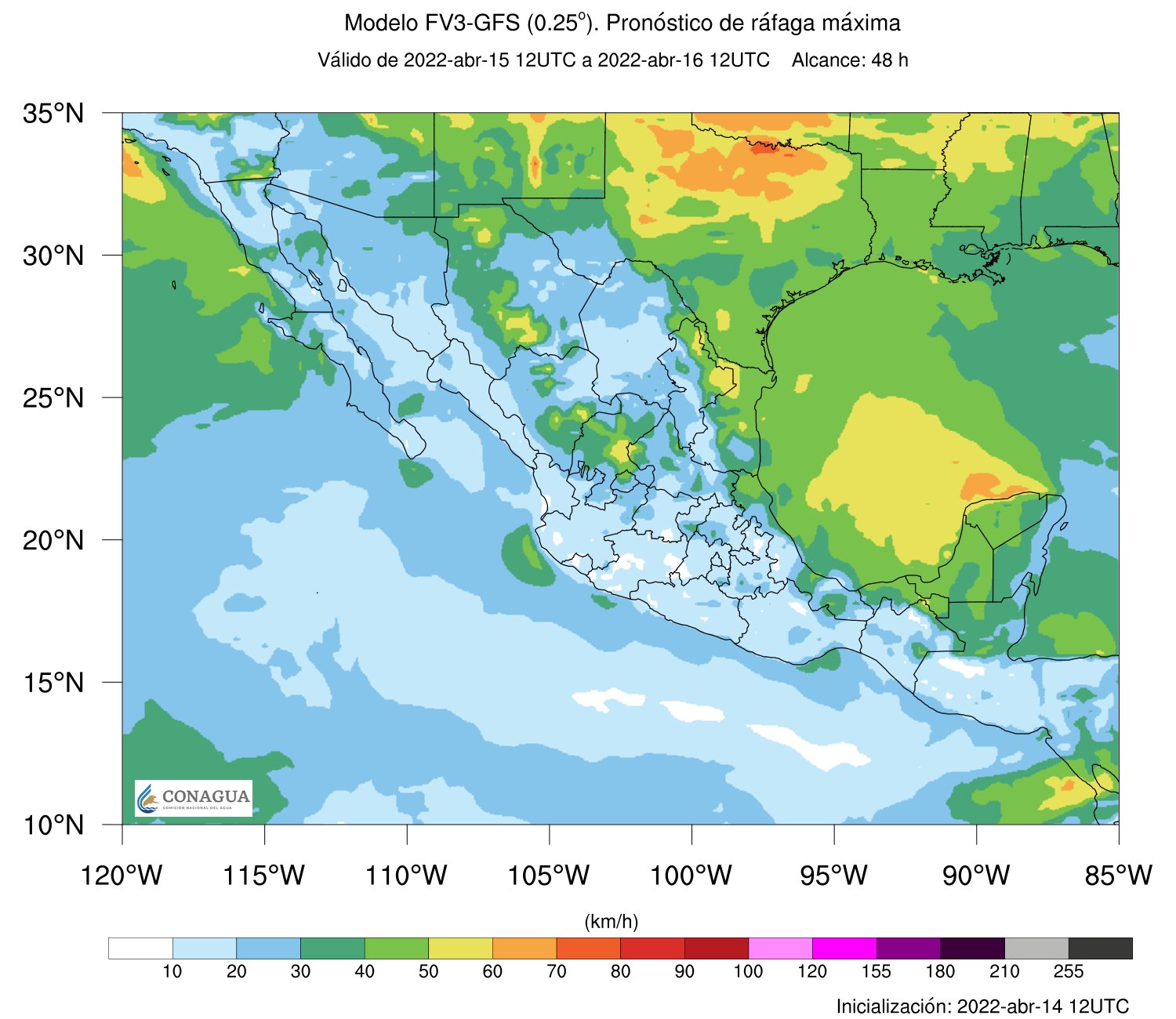 Golfo de México: Cielo medio nublado por la mañana y nublado durante la tarde; chubascos, descargas eléctricas y posible caída de granizo en Veracruz, así como lluvias aisladas en Tamaulipas. Sin lluvia en Tabasco. Ambiente fresco al amanecer con bancos de niebla en zonas serranas de la región y caluroso a muy caluroso por la tarde. Viento de componente este de 20 a 35 km/h; rachas de 50 a 60 km/h en Tamaulipas y rachas de hasta 50 km/h en el norte de Veracruz.