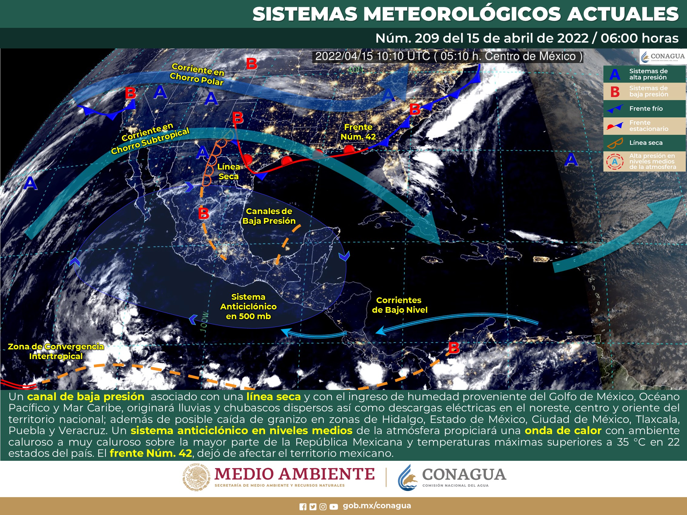 Por otra parte, un sistema anticiclónico en niveles medios de la atmósfera propiciará una onda de calor con ambiente caluroso a muy caluroso sobre la mayor parte de la República Mexicana y temperaturas máximas superiores a 35 °C en 22 estados del país,