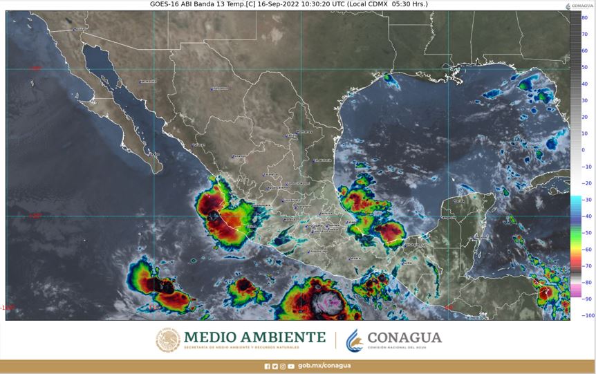 Pacífico Sur: Cielo nublado durante el día con lluvias puntuales torrenciales en Guerrero y Oaxaca, además de lluvias puntuales intensas en Chiapas; todas con descargas eléctricas; las lluvias podrían generar incremento en los niveles de ríos y arroyos, deslaves e inundaciones. Por la mañana, ambiente templado a fresco con bancos de niebla en sierras de la región. Por la tarde, ambiente de templado a cálido. Viento de dirección variable de 15 a 30 km/h con rachas de 60 a 70 km/h y oleaje de 2 a 3 metros en costas de Oaxaca y Guerrero.