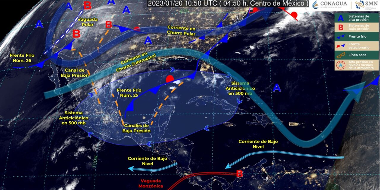 Por otra parte, el frente frío número 26, se desplazará sobre el noroeste del territorio nacional, asociado con una vaguada polar y con las corrientes en chorro polar y subtropical, generarán lluvias aisladas y rachas de vientos fuertes a muy fuertes con posibles tolvaneras.