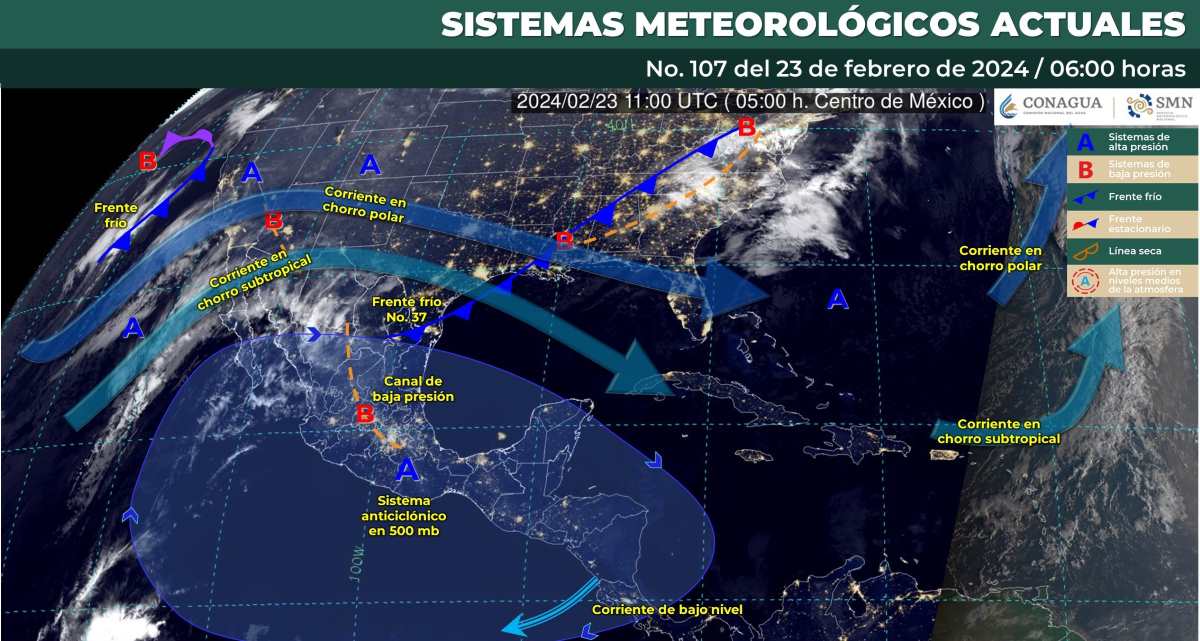 Pronóstico del clima para hoy viernes 23 de febrero de 2024 en Quintana Roo. Este día, el frente frío número 37 se desplazará sobre el noreste y oriente del país, interaccionará con un canal de baja presión que se extenderá sobre el sureste mexicano y originará lluvias e intervalos de chubascos en dichas regiones.