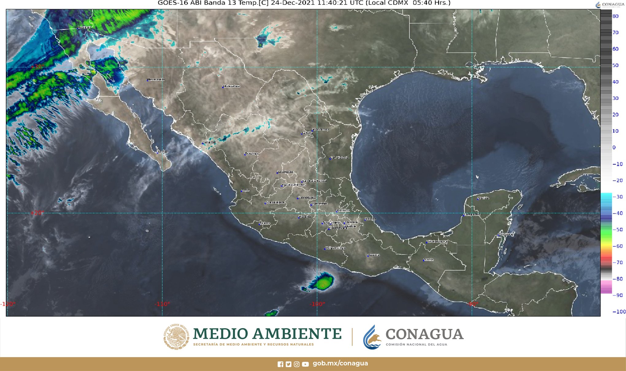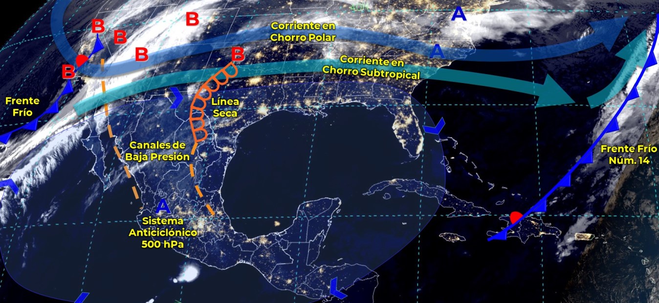 Pronóstico del clima para hoy viernes 24 de diciembre en Quintana Roo. Durante este día, se pronostica el ingreso de un nuevo frente frío sobre el noroeste de México, y en combinación con la entrada de humedad generada por la corriente en chorro subtropical, ocasionarán lluvias puntuales fuertes en Baja California y Sonora, además de vientos con rachas de 80 a 100 km/h y posible formación de tolvaneras en Baja California, Sonora y Chihuahua, así como rachas de 70 a 80 km/h en el Golfo de California. Asimismo, una línea seca, sobre el norte y noreste del territorio nacional propiciará vientos con rachas de 50 a 60 km/h en dichas regiones.