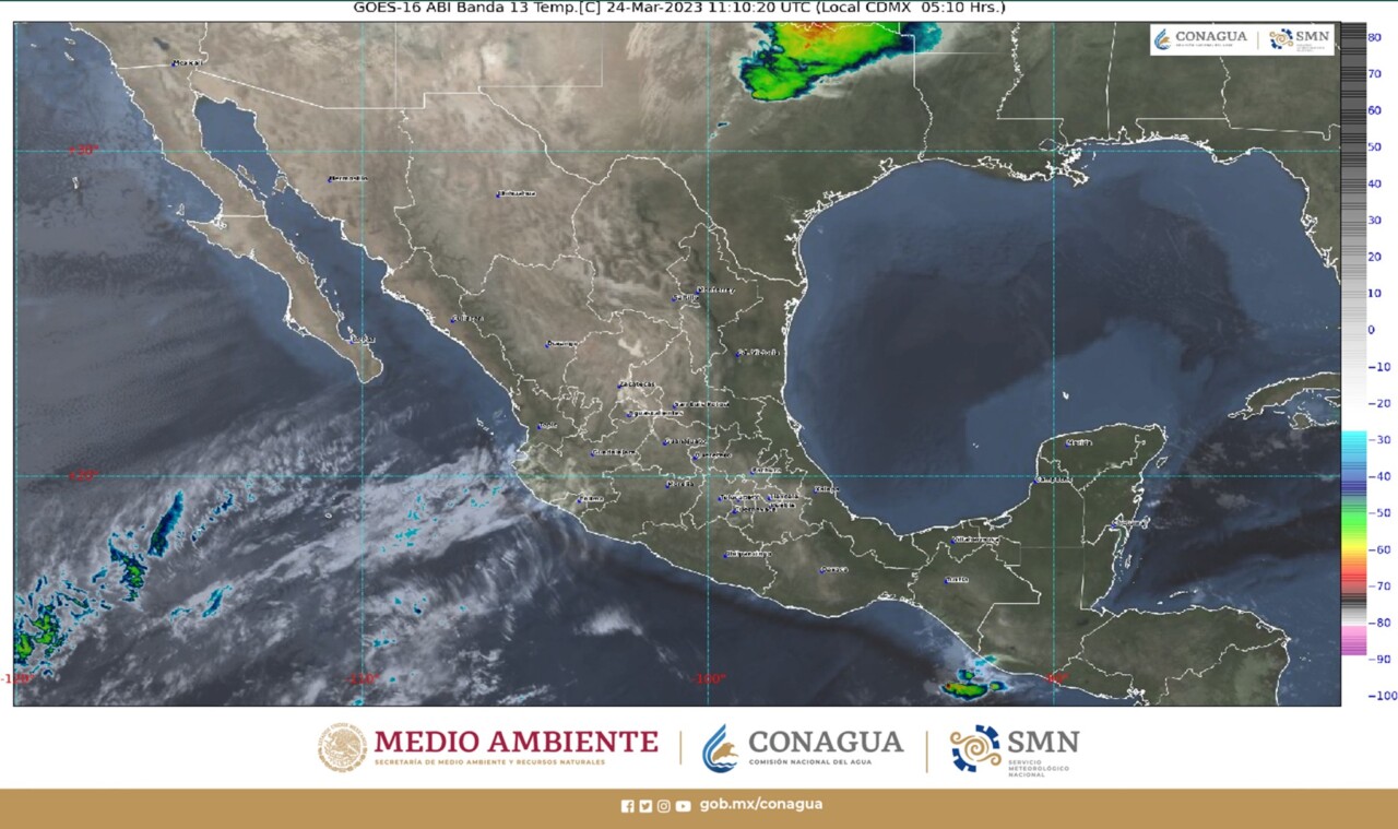 Por la noche, se espera el ingreso de un nuevo frente frío en el noroeste de México, en combinación con la corriente en chorro polar y una vaguada polar, provocarán lluvias aisladas en Baja California y vientos con rachas de 70 a 90 km/h y tolvaneras en Chihuahua.