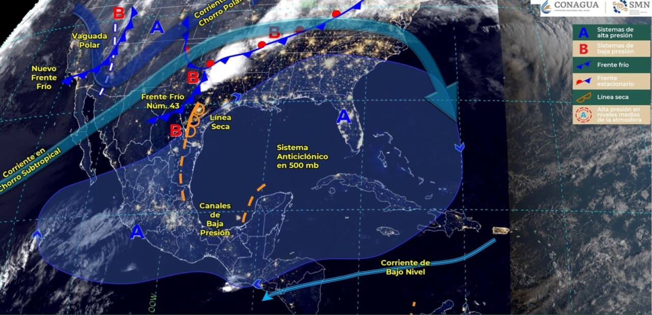 Por la noche, se espera el ingreso de un nuevo frente frío en el noroeste de México, en combinación con la corriente en chorro polar y una vaguada polar, provocarán lluvias aisladas en Baja California y vientos con rachas de 70 a 90 km/h y tolvaneras en Chihuahua.
