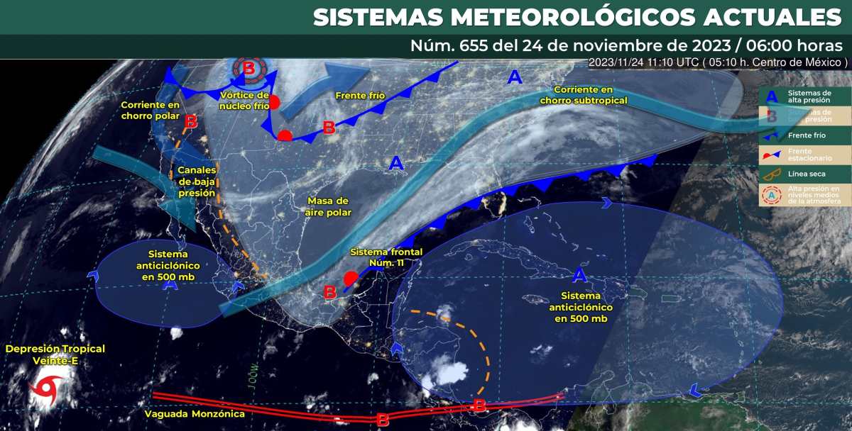 Pronóstico del clima para hoy viernes 24 de noviembre 2023 en Quintana Roo. Para este día, el sistema frontal número 11 se extenderá como cálido sobre el oriente y centro del Golfo de México, continuará interactuando con un canal de baja presión en el occidente de dicho golfo, provocando lluvias puntuales fuertes con descargas eléctricas en Chiapas, intervalos de chubascos en Nuevo León, Tamaulipas, Veracruz, Tabasco y la Península de Yucatán.