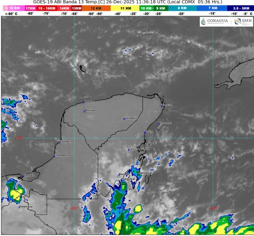Pronóstico del clima para hoy viernes 26 de diciembre 2025 en Quintana Roo.- Este día, un nuevo frente frío (número 24) ingresará a Baja California, en combinación con una vaguada en niveles medios y altos de la atmósfera, la corriente en chorro polar y un río atmosférico, generarán descenso de temperatura en el noroeste del territorio nacional, así como lluvias puntuales fuertes en Baja California; adicionalmente lluvias y chubascos en Baja California Sur, Sonora y Chihuahua.