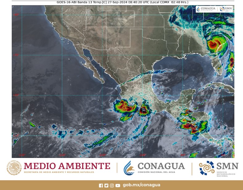 Pacífico Sur: Cielo nublado durante el día. Densos bancos de niebla en zonas altas. Por la mañana, lluvias aisladas y ambiente fresco, siendo templado en costas. Durante la tarde, ambiente fresco a templado, y cálido en zonas costeras. Lluvias puntuales extraordinarias en Guerrero y puntuales torrenciales en Oaxaca y Chiapas; todas con posibles descargas eléctricas, las cuales podrían ocasionar deslaves, inundaciones y encharcamientos.
