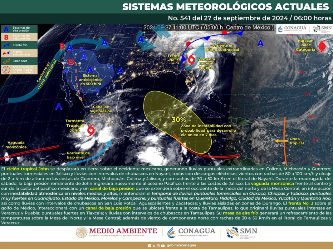 Pronóstico del clima para hoy viernes 27 de septiembre 2024 en Quintana Roo.- Para este día, el ciclón tropical «John» se desplazará en tierra sobre el occidente mexicano, generando lluvias puntuales extraordinarias en Colima, Michoacán y Guerrero; puntuales torrenciales en Jalisco y lluvias con intervalos de chubascos en Nayarit, todas con descargas eléctricas.