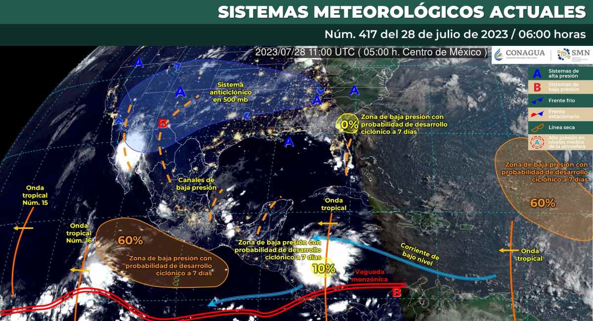 Pronóstico del clima para hoy viernes 28 de julio 2023 en Quintana Roo. Durante esta noche y madrugada del viernes, canales de baja presión sobre el occidente y centro del país, y otro en el sureste de México y la Península de Yucatán, en interacción con la abundante entrada de humedad del Océano Pacífico, Golfo de México y Mar Caribe, aunado a inestabilidad en niveles altos de la atmósfera, mantendrán condiciones para lluvias puntuales muy fuertes en zonas de Veracruz y Estado de México, lluvias fuertes en Nayarit, Jalisco, Colima, Michoacán, Ciudad de México, Guerrero, Oaxaca, Chiapas, Campeche y Yucatán, y chubascos en Baja California, Coahuila, Nuevo León, Tamaulipas, Zacatecas, San Luis Potosí, Aguascalientes, Guanajuato, Querétaro, Hidalgo, Puebla, Tlaxcala, Morelos, Tabasco y Quintana Roo.