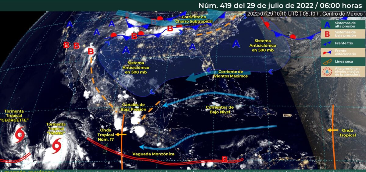 Por su parte, un canal de baja presión sobre el interior del país, en interacción con el desplazamiento de la onda tropical número 17, extendida sobre el oriente de la mesa central y el sur del litoral del Pacífico Mexicano y gradualmente sobre el occidente de México, así como la entrada de humedad de ambos océanos y una zona de inestabilidad en niveles altos de la atmosfera, ocasionarán lluvias puntuales fuertes a muy fuertes sobre el centro y sur del país, incluido el Valle de México, y lluvias puntuales muy fuertes a intensas en zonas del occidente del territorio mexicano.