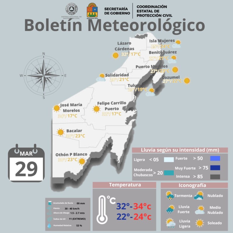 Pronóstico del clima para hoy viernes 29 de marzo de 2024 en Quintana Roo; cielo parcialmente nublado y sin lluvia. Ambiente muy caluroso durante la tarde.