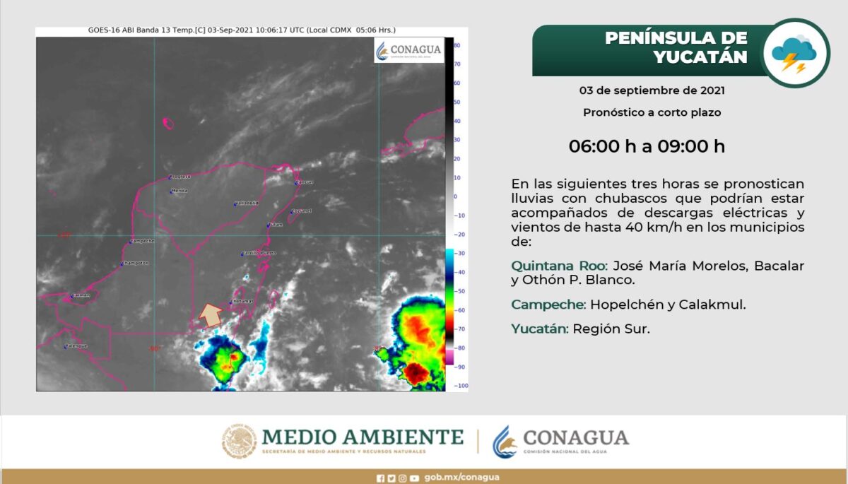 Península de Yucatán: Cielo medio nublado en la mañana y nublado por la tarde con lluvias puntuales muy fuertes en el sur de Quintana Roo, además de lluvias fuertes en Campeche y Yucatán. Ambiente cálido por la mañana y caluroso durante por la tarde. Viento del sureste de 10 a 25 km/h en la región con rachas de 50 a 60 km/h en zonas costeras de la región.