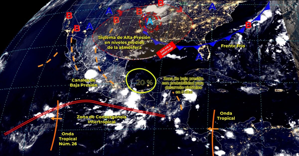 La onda tropical número 26 dejó de afectar al territorio nacional. El ingreso de humedad proveniente del Océano Pacífico, provocará lluvias muy fuertes a intensas en el occidente y sur del país.