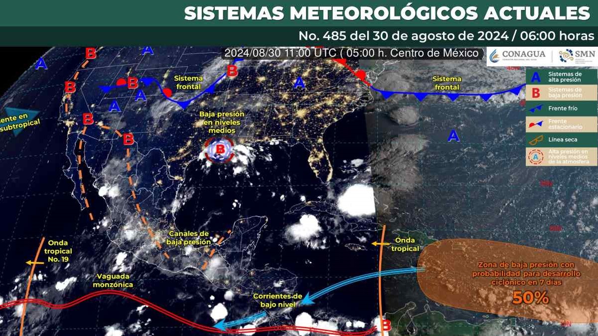 Una nueva onda tropical se desplazará sobre el occidente del mar Caribe y se aproximará hacia el oriente de la península de Yucatán. Finalmente, prevalecerá el ambiente cálido a caluroso por la tarde en la mayor parte de los estados de la República Mexicana, con temperaturas máximas muy calurosas superiores a 40 °C en zonas de Baja California y Sonora.
