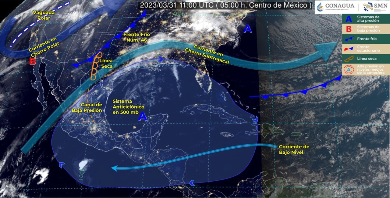 Finalmente, una circulación anticiclónica en niveles medios de la atmósfera mantendrá ambiente vespertino cálido a caluroso sobre gran parte del territorio mexicano, con temperaturas máximas muy calurosas, superiores a 40 °C, en zonas de Sinaloa, Nayarit, Jalisco, Colima, Michoacán y Guerrero.