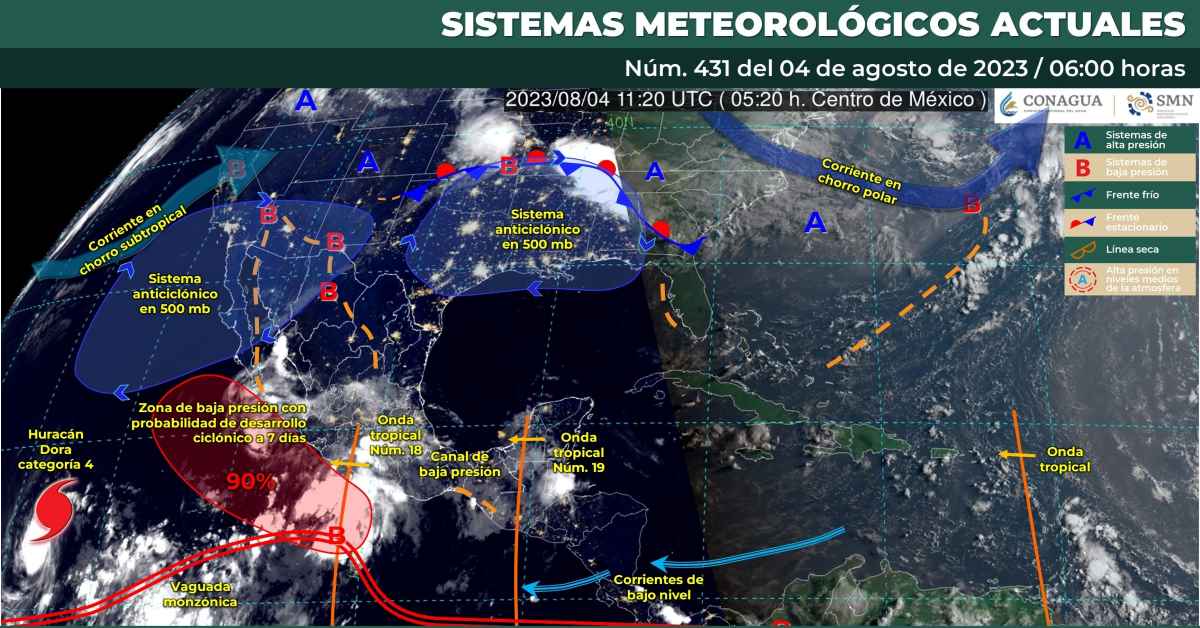 Pronóstico del clima para hoy viernes 4 de agosto 2023 en Quintana Roo. Para este día, la onda tropical número 18 se desplazará sobre el occidente del país y seguirá interactuando con una zona de baja presión con probabilidad de desarrollo ciclónico que se ubicará al sur de las costas de Colima y Jalisco, lo que ocasionará lluvias puntuales intensas con descargas eléctricas en Guerrero, Michoacán, Colima, Jalisco y Nayarit; y rachas de viento de 60 a 80 km/h con oleaje de 2 a 4 metros de altura en las costas de Guerrero, Michoacán y Colima.
