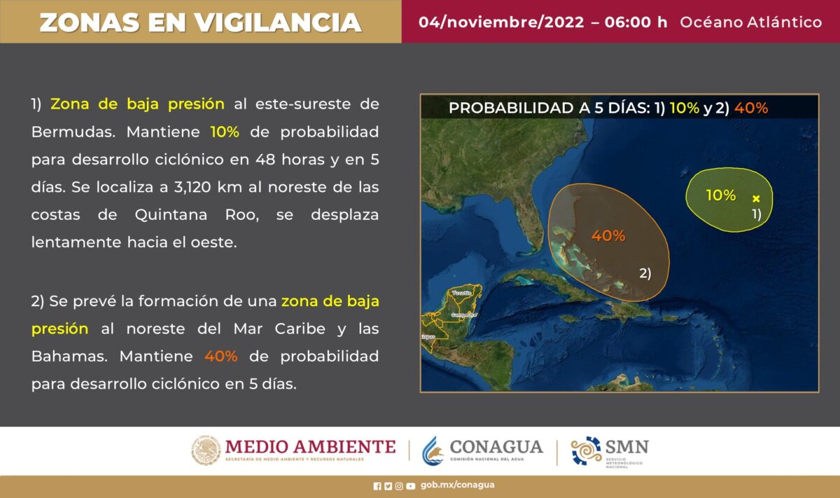 Pronóstico del clima para hoy viernes 4 de noviembre en Quintana Roo. Este día, la depresión tropical “Lisa” se desplazará frente a la costa sur de Veracruz, sus bandas nubosas propiciarán lluvias fuertes a muy fuertes y descargas eléctricas en Veracruz, Oaxaca, Chiapas, Tabasco y Campeche.
