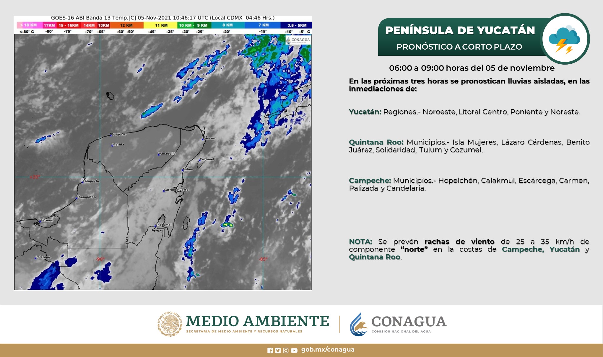 Península de Yucatán: Cielo medio nublado a nublado. Intervalos de chubascos en Campeche, Yucatán y Quintana Roo. Ambiente templado al amanecer y cálido durante el día. Evento de “Norte” con rachas de 50 a 60 km/h en costas de Campeche, Yucatán y Quintana Roo.