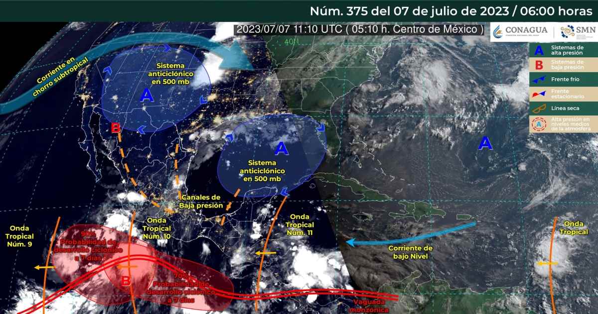 Asimismo, la onda tropical 11 se aproximará a la Península de Yucatán y el sureste mexicano; y en interacción con un canal de baja presión extendido sobre dichas regiones y con una zona de baja presión con probabilidad para desarrollo ciclónico al sur de las costas de Oaxaca y Guerrero, propiciarán lluvias muy fuertes a puntuales intensas con descargas eléctricas y posible caída de granizo en zonas de Oaxaca, Chiapas y Guerrero; así como fuertes en Veracruz, Tabasco, Campeche, Yucatán y Quintana Roo.