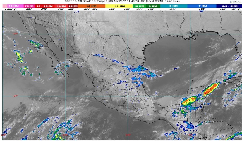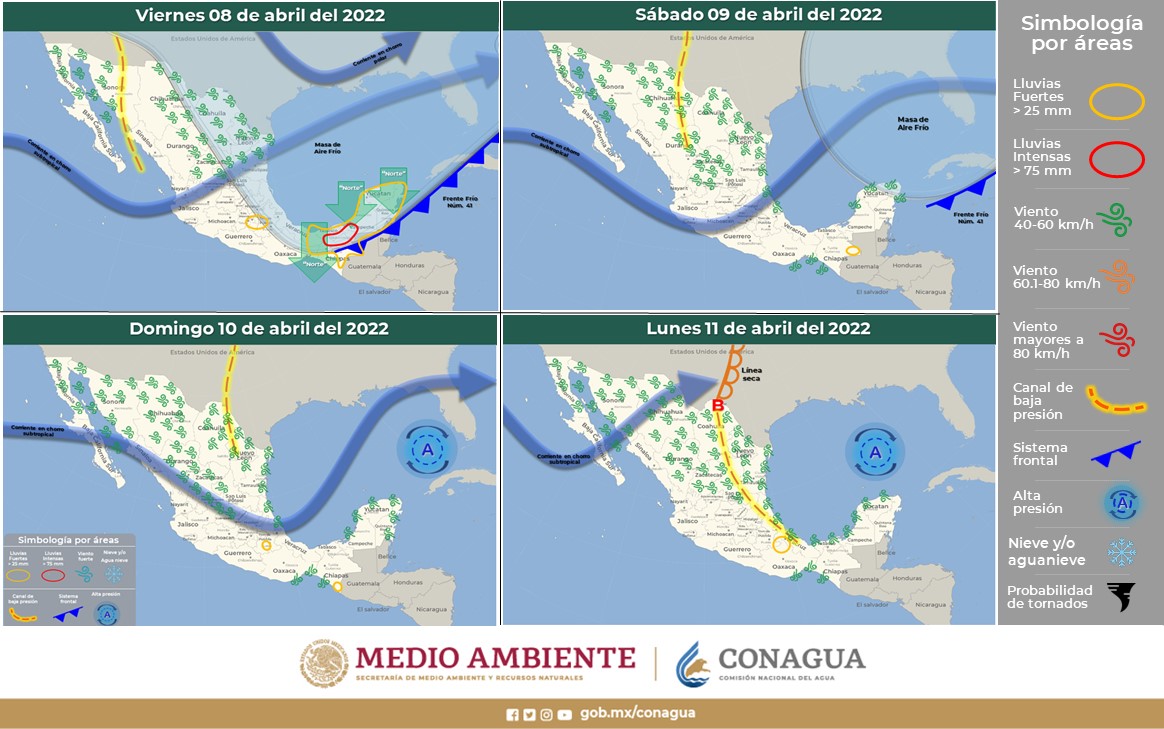 Pacífico Sur: Cielo nublado con lluvias puntuales intensas en Chiapas, muy fuertes en Oaxaca y chubascos en Guerrero; todas con descargas eléctricas y probable caída de granizo en Chiapas. Ambiente fresco por la mañana con bancos de niebla en zonas serranas y caluroso a muy caluroso por la tarde en zonas costeras. Evento de “Norte” con rachas de viento de 80 a 100 km/h en el Istmo y Golfo de Tehuantepec. Oleaje de 3 a 5 metros de altura en el Golfo de Tehuantepec.