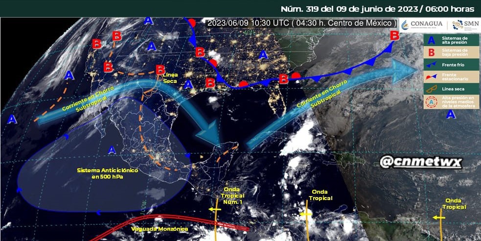 Una circulación anticiclónica en niveles medios de la atmósfera mantendrá la tercera onda de calor sobre el territorio nacional, pronosticándose temperaturas superiores a los 40 °C en 19 estados del país. La primera onda tropical de la temporada, se desplazará sobre el Golfo de Tehuantepec, sin generar efectos sobre el territorio nacional.