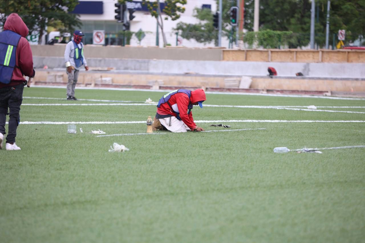 De igual forma, detalló que con el apoyo de 36 trabajadores en total, también se continúa con el injerto de líneas delimitadoras de los espacios de juego, además de que se coloca las pequeñas estructuras de concreto en las que se fijarán los postes para el cercado de protección a la zona.