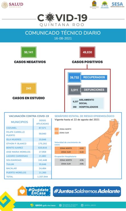 También se informa, dentro del mismo informe de la Sesa, que dentro de los esfuerzos de contención de la pandemia, se han aplicado hasta el momento en la campaña permanente de vacunación contra el virus, un total de un millón 337 mil 944 dosis de la vacuna contra el covid-19 en Quintana Roo.