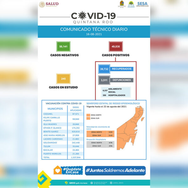 También se informa, dentro del mismo informe de la Sesa, que dentro de los esfuerzos de contención de la pandemia, se han aplicado hasta el momento en la campaña permanente de vacunación contra el virus, un total de un millón 337 mil 944 dosis de la vacuna contra el covid-19 en Quintana Roo.